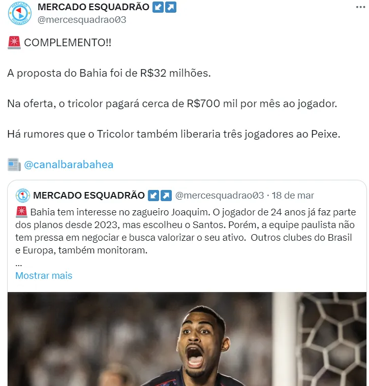 Ainda de acordo com a fonte da matéria, há rumores de que o Bahia poderia tentar oferecer até três jogadores do elenco ao Santos para convencer o Peixe a fazer negócio por Joaquim Henrique.