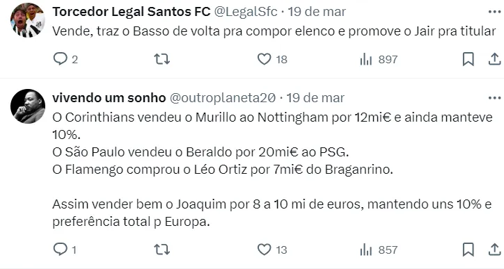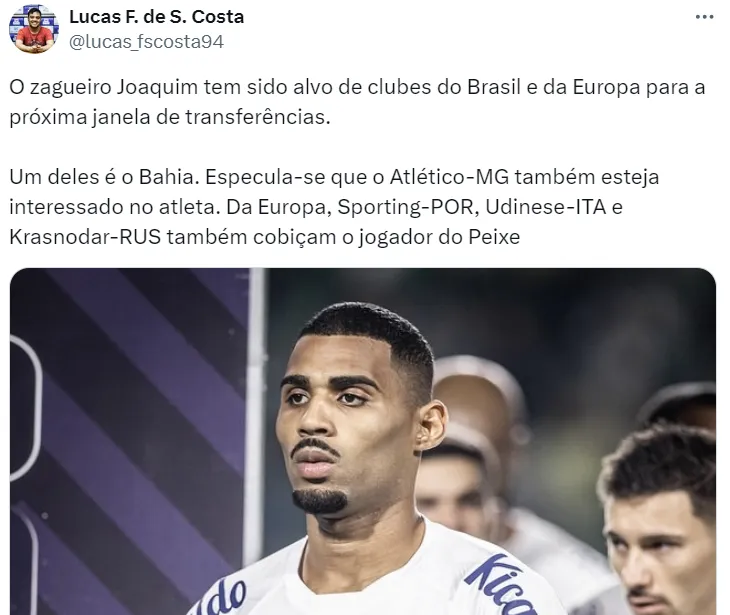 “Joaquim, fala-se que está tudo certo, empréstimo do zagueiro do Santos, uma grata surpresa, um garoto que se revelou bem e foi comprado pelo Santos há dois anos por R$ 16 milhões, e está passando para o Bahia por R$ 26 milhões. Vem por empréstimo. No final do ano, o Bahia completa os 5 milhões de euros”, disse o repórter.