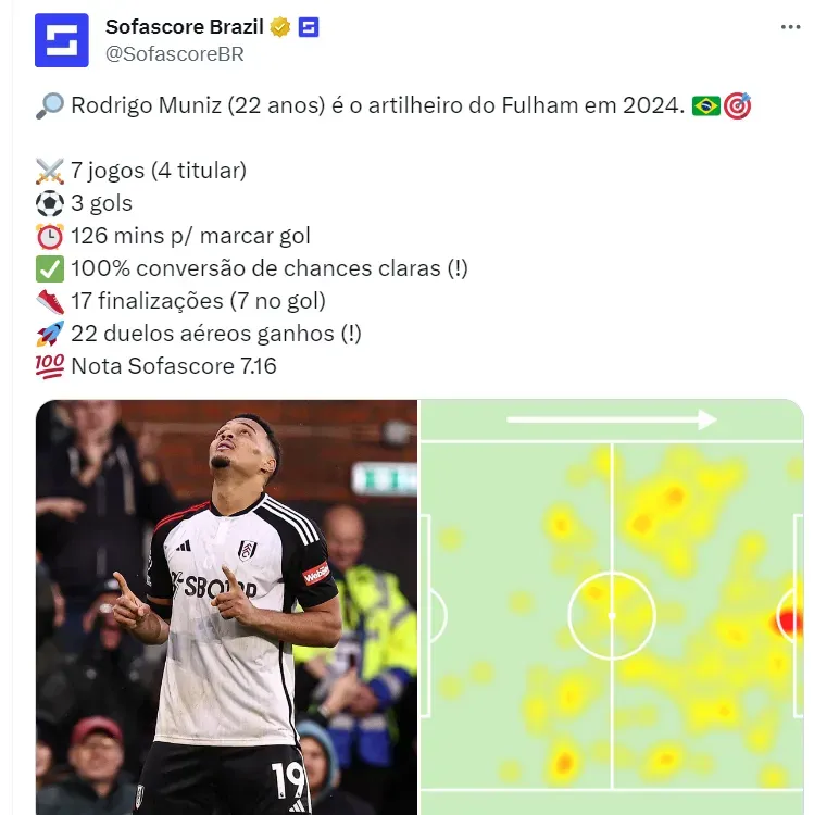 Em 2024, Rodrigo Muniz atuou em sete partidas (quatro como titular) e anotou três gols. Ele também se destaca por seu grande desempenho nos duelos vencidos.