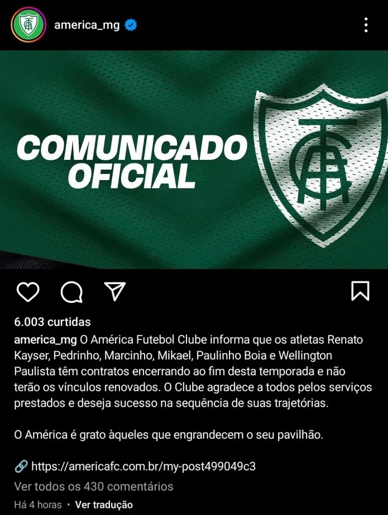 Por meio de suas redes sociais, o América MG revelou que está dispensando seis atletas do seu elenco para a próxima temporada.