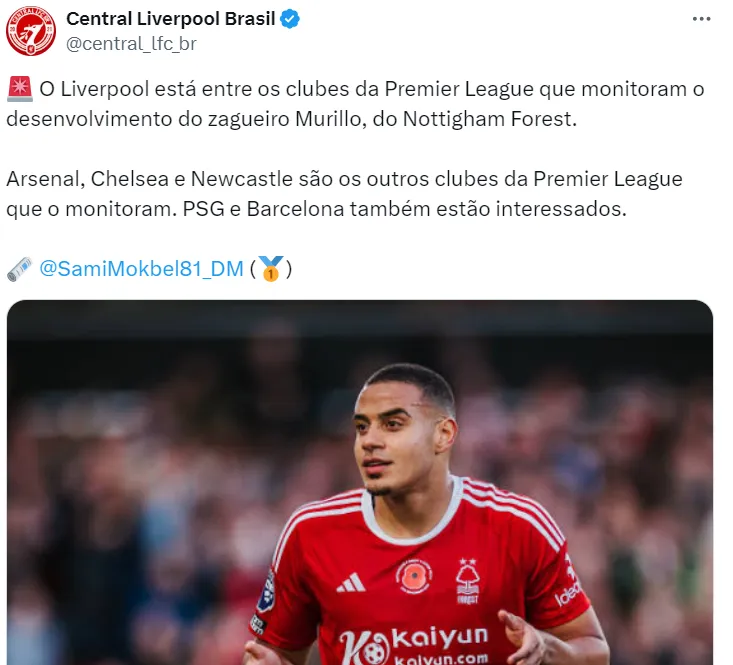 Os Reds monitoram a situação de perto do jogador com o Forest. A saída de Matip deixará uma vaga no elenco dos Reds e Murillo pode ser esse jogador para substituir o camaronês.