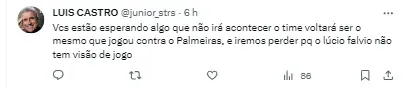 Em uma conversa com Lúcio Flávio foi de que os resultados nas últimas partidas foram abaixo do esperado, ainda segundo o portal. Não há 100% de satisfação com o trabalho até aqui, mas que uma alteração no comando neste momento seria ainda mais prejudicial ao elenco.
