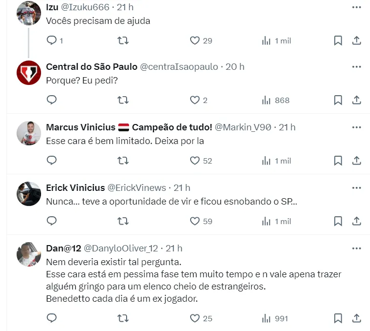 Apesar da possibilidade de mercado, parte dos torcedores do Tricolor Paulista são contra uma possível chegada de Benedetto ao time paulista. Eles entendem que, atualmente, o argentino não vive grande fase.