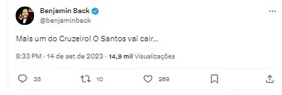 “Mais um do Cruzeiro! O Santos vai cair…”, escreveu Benja.