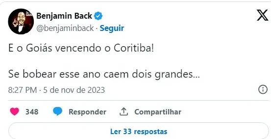 “E o Goiás vencendo o Coritiba! Se bobear, esse ano caem dois grandes…”, alertou Benja, ressaltando o drama vivido pelos times que buscam evitar a queda para a Série B.