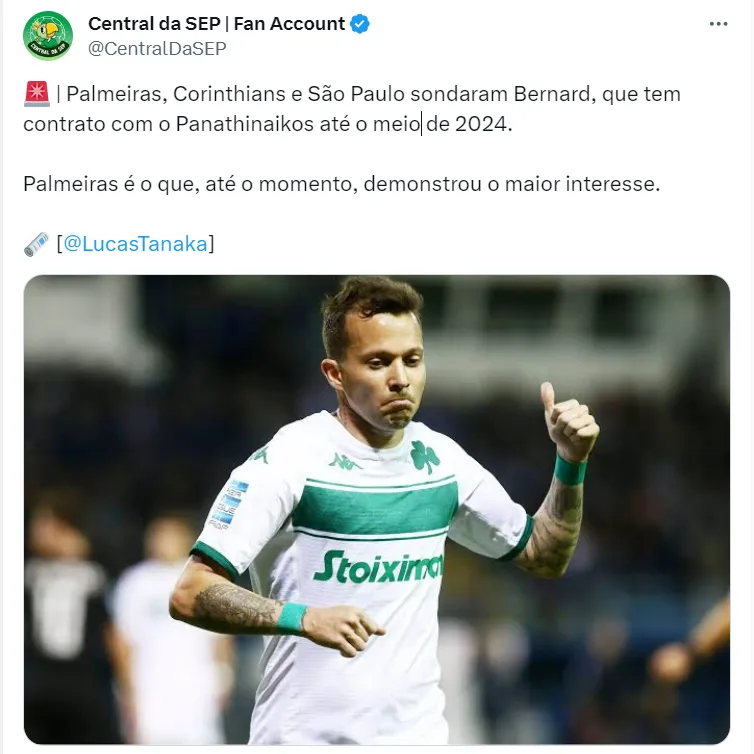 O atacante Bernard, de 31 anos de idade, ex-Atlético-MG e, atualmente, no futebol europeu, onde defende as cores do Panathinaikos, é alvo do Palmeiras e de outros dois clubes do futebol brasileiro.