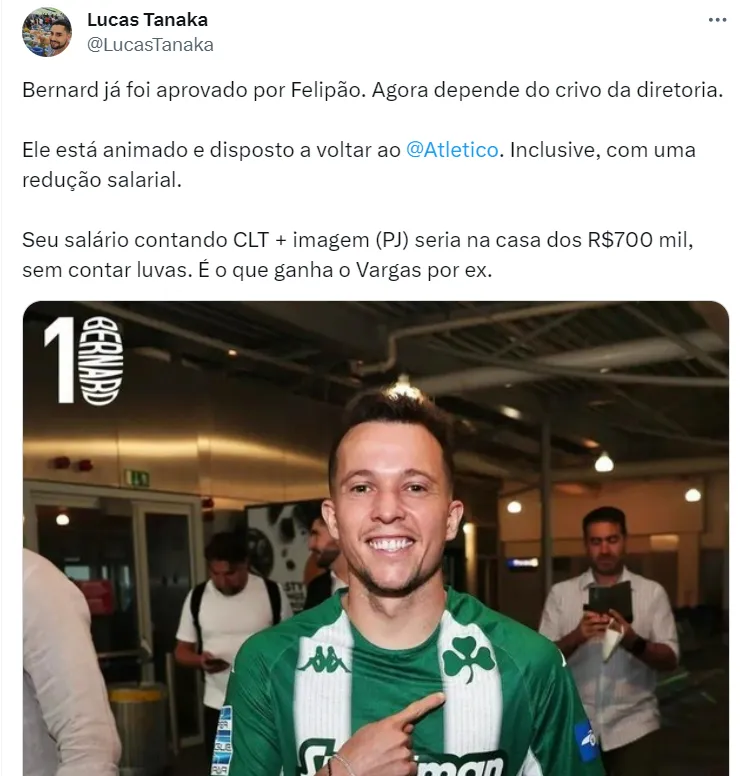 Bernard seguirá tentando convencer o Atlético-MG que vale a pena investir em seu futebol. Inclusive, segundo Lucas Tanaka, o jogador estaria aberto em diminuir seu salário para voltar ao clube.