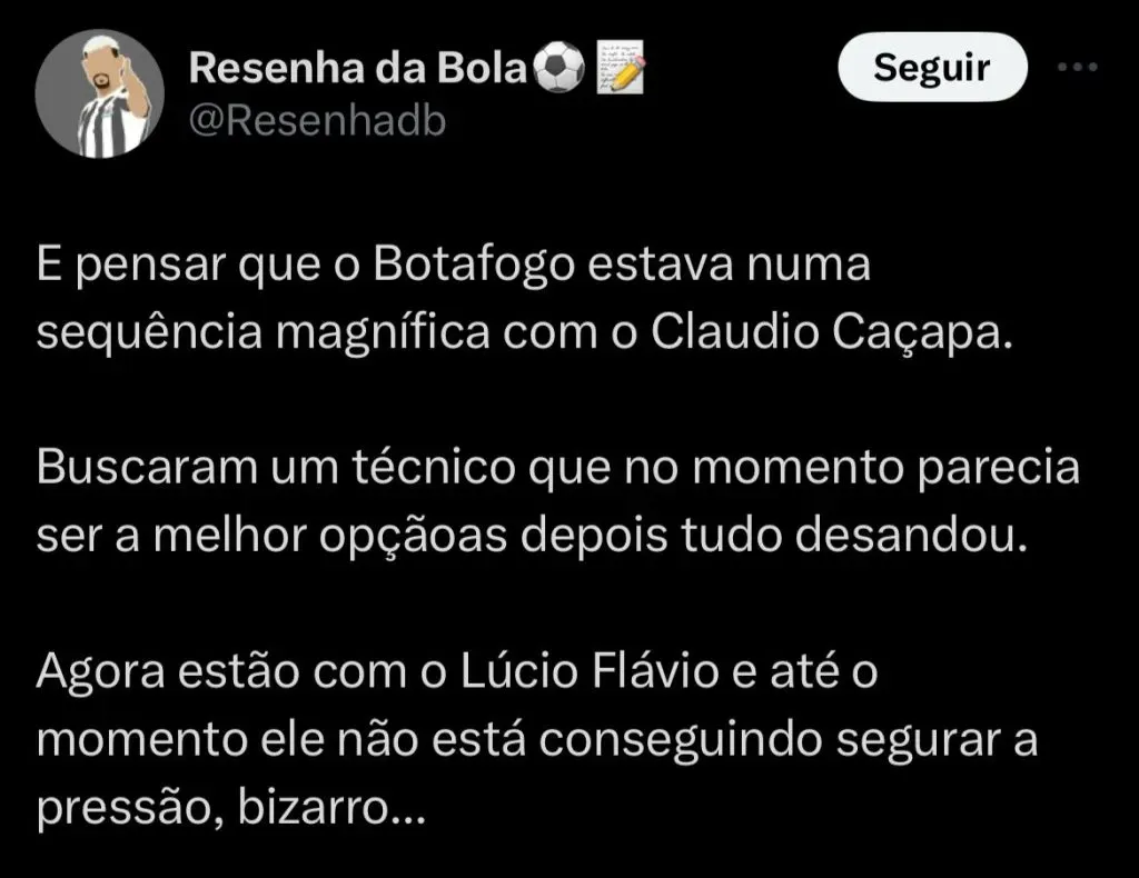 Além da excelente pontuação, outra coisa que surpreende no Botafogo em 2023 são as trocas de técnicos. Com a mudança, o próximo pode ser o quinto a comandar o clube no Campeonato Brasileiro. Antes, passaram Luís Castro, Claudio Caçapa (interinamente), Bruno Lage e Lucio Flavio.