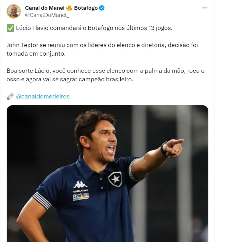 O Botafogo agiu rapidamente e definiu seu novo treinador para o restante do Brasileirão de 2023: Lúcio Flávio. Ele comandará o Botafogo nos próximos 13 jogos no Brasileirão.