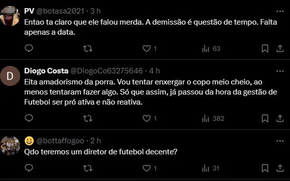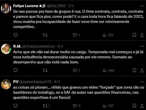 As últimas declarações do treinador não incomodam a SAF do Botafogo, que também entende que o plantel profissional precisa de uma reformulação. Até aqui, já foram 14 saídas e nove chegadas.