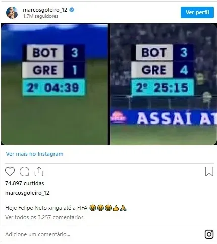 “Hoje Felipe Neto xinga até a FIFA”, postou Marcos em sua conta no Instagram.