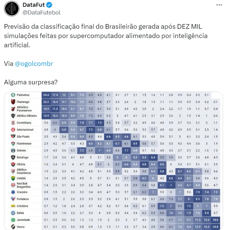 Após mais de dez mil simulações feitas pela Inteligência Artificial por um supercomputador, os estudos chegaram à conclusão que o Palmeiras será, novamente, campeão brasileiro. Lembrando que o Verdão é o maior campeão do país.