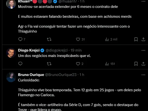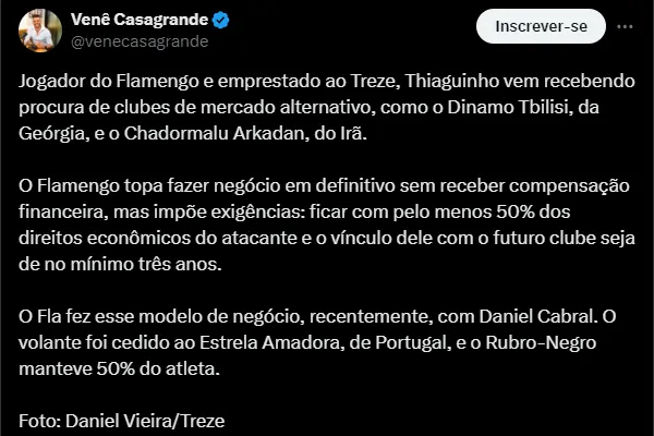 “Jogador do Flamengo e emprestado ao Treze, Thiaguinho vem recebendo procura de clubes de mercado alternativo, como o Dinamo Tbilisi, da Geórgia, e o Chadormalu Arkadan, do Irã”, destaca.