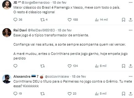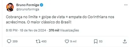 No seu perfil na plataforma X (antigo Twitter), o comentarista do TNT Sports, Bruno Formiga, descreveu Corinthians e Palmeiras como o maior clássico do futebol brasileiro.