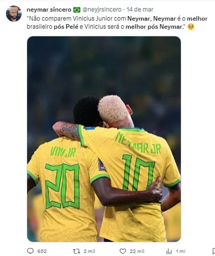 Na comparação com outros talentos, Formiga colocou Neymar como o segundo na lista, superando nomes como Endrick, Vini Jr. e Ronaldinho Gaúcho.