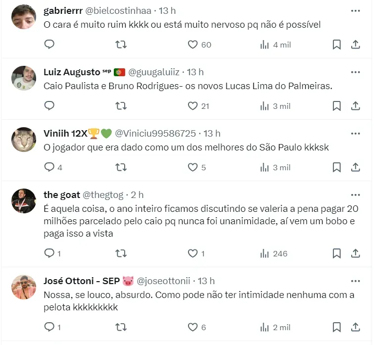 No Palmeiras, Caio Paulista soma poucos minutos em campo, mas já sofre com críticas por parte da torcida do Verdão nas redes sociais, movimento que chegou até na torcida do São Paulo, que tratou de dar aquela leve e boa provocada no atleta.