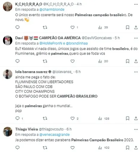 “Por isso acredito que o Palmeiras vai ser campeão. Porque é um time que sabe responder sob pressão. No Botafogo, esse emocional está fazendo falta”. finalizou