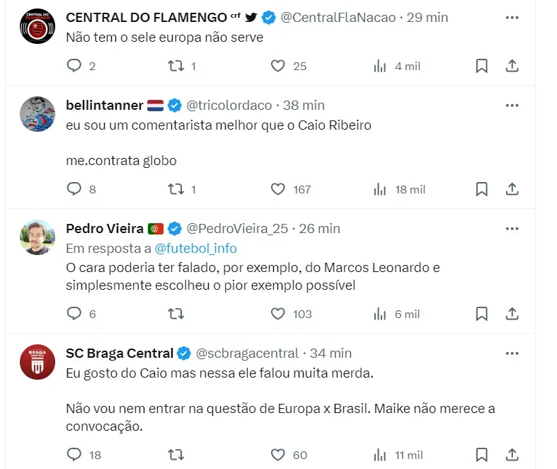 “Por que só pelo fato de jogarem na Europa alguns jogadores merecem mais uma convocação do que o Mayke, do Palmeiras? O Mayke joga final de Libertadores, final de Brasileirão e está acostumado com a pressão. Você vai me dizer que o Brighton tem mais pressão que o Palmeiras?”, começa Caio Ribeiro.