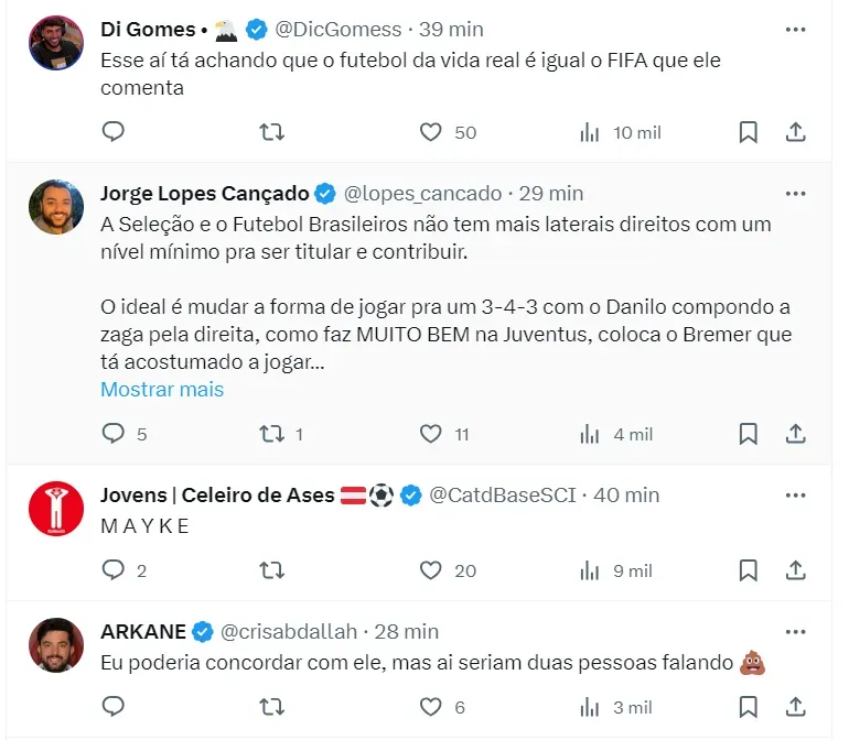 “Você vai me dizer que jogar na Turquia ou em um time mediano da Inglaterra tem mais desafio do que jogar no Flamengo, Atlético-MG, Palmeiras, São Paulo ou Fluminense? Por que não dar uma oportunidade para esses jogadores? O Mayke merece uma oportunidade, o Ayrton Lucas, que voltou a jogar no Flamengo, também merece”, finaliza.