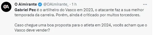 Pedrinho, eleito o novo presidente do Vasco, ainda teria dito que vai cobrar caro pelo jogador. Gabriel Pec tem contrato com o clube carioca até dezembro de 2026.