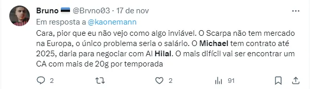 Michael volta a ser comentado nos bastidores do futebol brasileiro. Hoje no Al-Hilal, da Arábia Saudita, o jogador soma 23 jogos na atual temporada, com quatro gols e duas assistências.