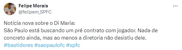 Isso porque, de acordo com Felipe Morais, o São Paulo quer fechar um pré-contrato com Di María. Assim, garantiria um acordo antecipado para que ele chegue no meio do ano.