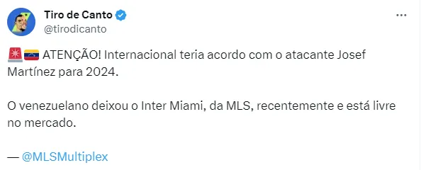 Josef Martínez estaria perto de desembarcar no futebol brasileiro. Atualmente, o venezuelano está livre no mercado da bola. O último clube do atleta foi o Inter Miami.