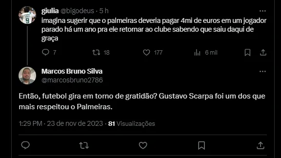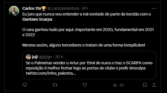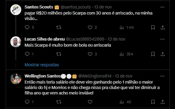 “Todo bom jogador é sempre bem-vindo. Ainda recentemente, li que Scarpa não pretende voltar ao Brasil agora, mas, sem dúvida, acrescentaria muito ao Santos Futebol Clube”, disse o candidato.