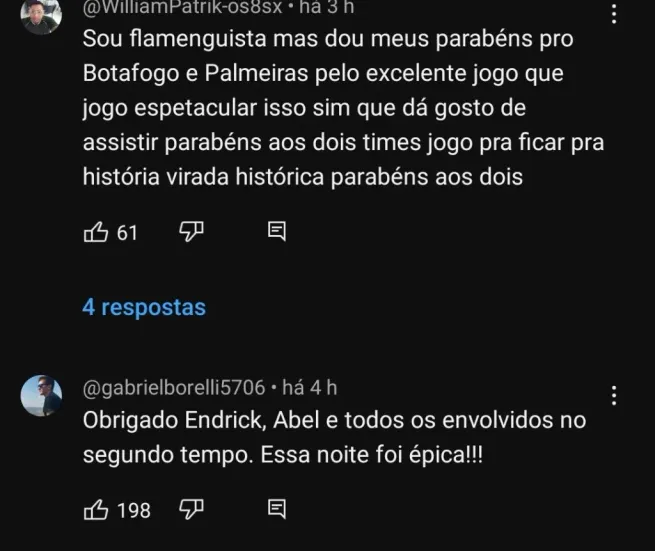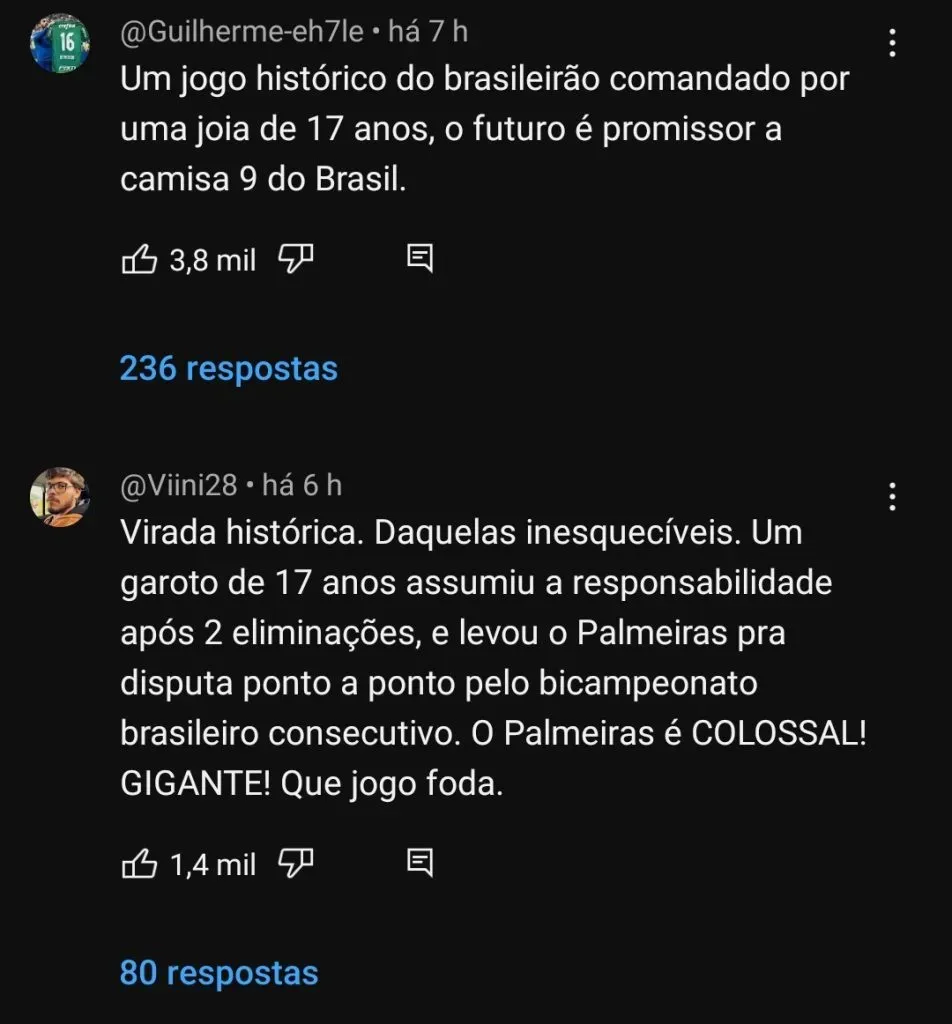 “É o início do arranque do título do Palmeiras. Ele vencerá o Brasileiro e começa hoje. 2 a 1”. Ressaltou o jornalista, que é assumidamente torcedor do Athletico Paranaense.