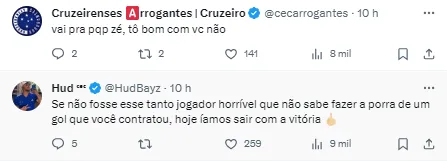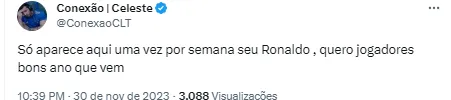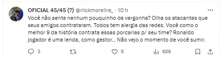 “Se não fosse esse tanto jogador horrível que não sabe fazer a p… de um gol que você contratou, hoje íamos sair com a vitória” , “Só aparece aqui uma vez por semana seu Ronaldo. Quero jogadores bons ano que vem” , “Vai pra pqp” , “Aposto que nem viu o jogo!” , “Mermão se a gente não cair você pode dar graças a Deus à torcida. Porque o elenco que você e sua turma de incompetentes montou foi péssimo”, publicaram.