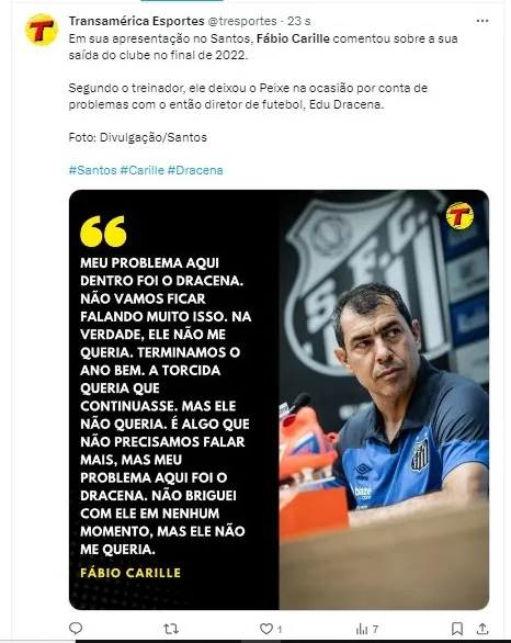 Ao falar sobre sua saída do Peixe no primeiro semestre de 2022, Carille mencionou problemas com Edu Dracena, diretor de futebol à época.