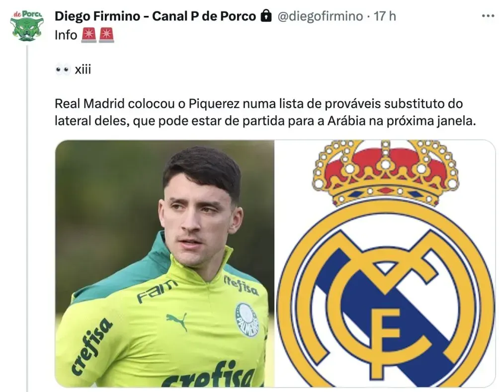 A informação de que Piquerez é alvo do Real Madrid é passada pelo setorista Diego Firmino, que conta que o defensor encontra-se na lista de possíveis reforços do clube espanhol.