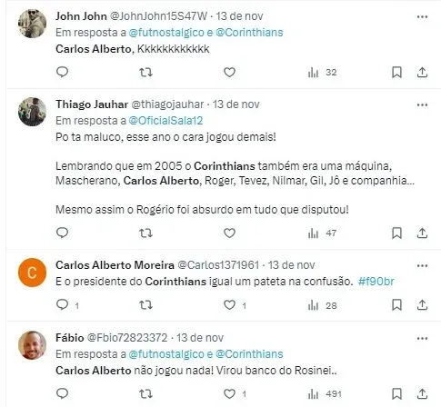 “O time mais desunido que eu joguei foi esse Corinthians. União é arroz. Você não precisa ser amigo de ninguém, precisa só jogar. Dentro do campo que vocês precisam se respeitar. Se puder ter uma comunicação fora do campo, melhor ainda. Mas, se não tem, esquece”, comentou Carlos Alberto.