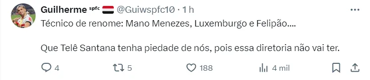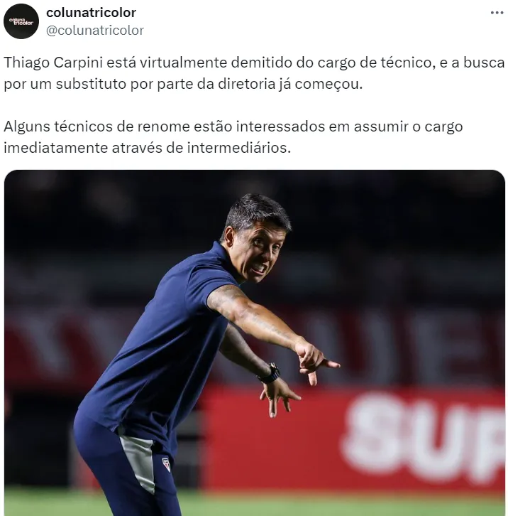 No momento, o São Paulo segue com Carpini no comando. Inclusive, o treinador é cotado para estar à frente da equipe no próximo jogo do Brasileirão, que será contra o Flamengo, no Rio.