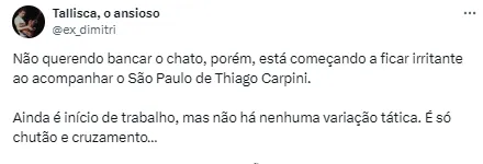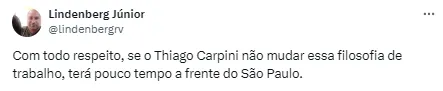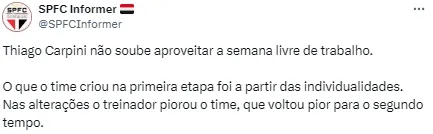 Não se descarta que Carpini não esteja à frente do São Paulo no Brasileirão em caso de tropeços. Isso aconteceria em caso de o treinador não assegurar a classificação, ainda de acordo com informações do jornalista.