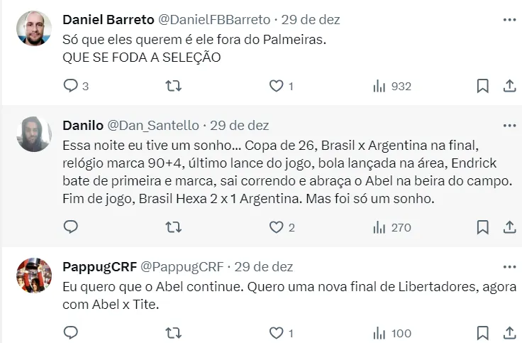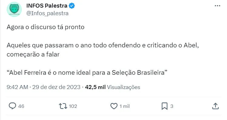 A situação de Abel Ferreira com o Palmeiras é de um contrato que vai até dezembro de 2024. Por parte do técnico, ele deseja cumprir seu restante de vínculo com o Verdão.