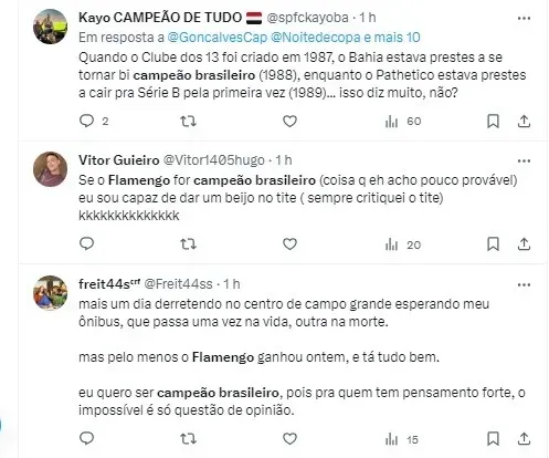 “Se deixarem o Flamengo chegar, já era”, disse Casagrande no título da publicação. “Só que não pode mais oscilar e tem que vencer os seis jogos que lhe restam e mesmo assim depende de outros resultados. Terá no dia 22/11 o confronto direto, também no Rio, contra o Red Bull Bragantino e nesse segundo turno já venceu o Botafogo e Palmeiras, mas perdeu para o Grêmio nesses jogos decisivos”, disse.