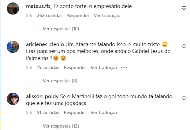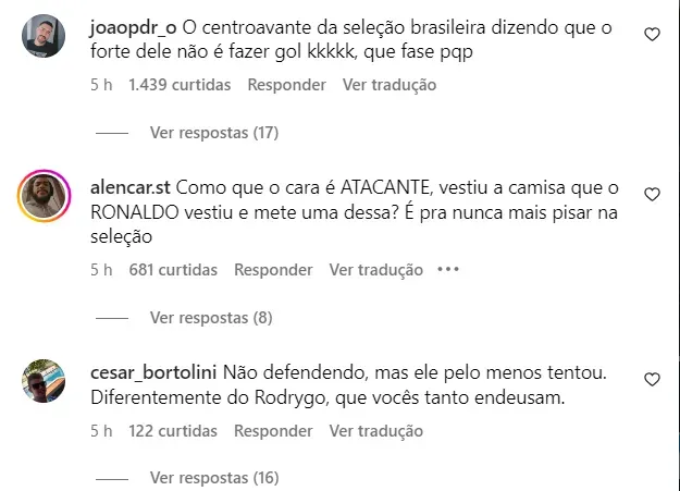 “A primeira foi ele ter afirmado que o seu forte não é fazer gols. Mas ele é o camisa 9 da seleção brasileira e é convocado justamente para fazer gols. Como pode dizer uma coisa dessas? Ontem, Gabriel Jesus fez apenas uma jogada durante todo o jogo e, mesmo assim, foi tropeçando na bola. Mais uma vez Gabriel Jesus não finalizou uma bola ao gol”, aponta o comentarista.