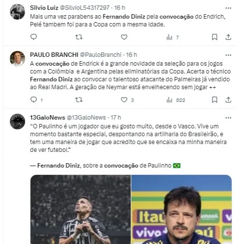 Casagrande elogiou as novidades apresentadas por Fernando Diniz: “Gostei das novidades que Fernando Diniz apresentou hoje. É isso mesmo que precisa ser feito: formar um novo time, com uma nova cara para reconquistar o incrédulo torcedor brasileiro. Endrick, Pepê, Paulinho e João Pedro foram chamados por Diniz pela primeira vez, o que nos dá um ar de esperança, visto que não sabemos o que é isso desde 2018.”