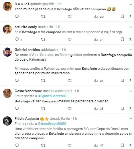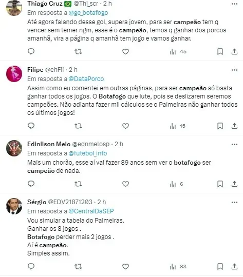 Mesmo com a vantagem diminuindo, Casagrande está confiante que o título ficará com o fogão. “Com 80% de chances de ser campeão brasileiro, ainda acredito que o Botafogo ficará com a taça. Mas muitas emoções ainda virão”.