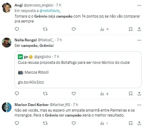 “O Grêmio tem um algo a mais com o número 9. Esse cara é um algo a mais no campeonato. As próximas duas rodadas, teoricamente, é totalmente favorável ao Grêmio. Acho que o Grêmio termina em primeiro lugar antes da data Fifa. Se o Botafogo empatar ou perder do Bragantino, e o Grêmio ganhar do Corinthians, termina em primeiro lugar antes da data Fifa. O Flamengo não consegue passar ninguém nessa rodada.”, disse Casagrande no programa Fim de Papo, do UOL Esporte.