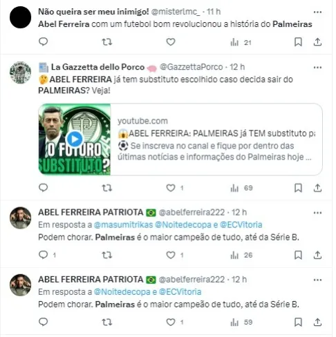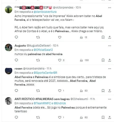 Abel acumula dois títulos da Libertadores, uma Copa do Brasil, dois Paulistas, uma Recopa Sul-Americana e uma Supercopa do Brasil. A próxima partida do Verdão, após a pausa da Data Fifa, está marcada para o dia 26 de novembro, contra o Fortaleza, fora de casa.