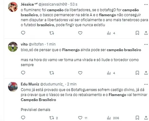 “Eu concordo com o Casagrande. Não vejo o Flamengo como candidato ao título. Só existe uma combinação de resultados que poderia reacender as esperanças: vencer o Palmeiras e o Bragantino. Se o Flamengo conquistar essas duas vitórias, terá alguma chance nas últimas rodadas. Mas, francamente, vocês têm acompanhado o Flamengo jogar? Eles jogaram bem (contra o Fortaleza) e foram sufocados no segundo tempo. O futebol do Flamengo não está no mesmo nível da tragédia do Sampaoli, mas não inspira confiança em ninguém. Na minha opinião, o título seria apenas para garantir o Flamengo no G-4. A briga está complicada ali, com Grêmio, Atlético-MG, Flamengo e Athletico disputando a última vaga do G-4,” afirmou RMP.