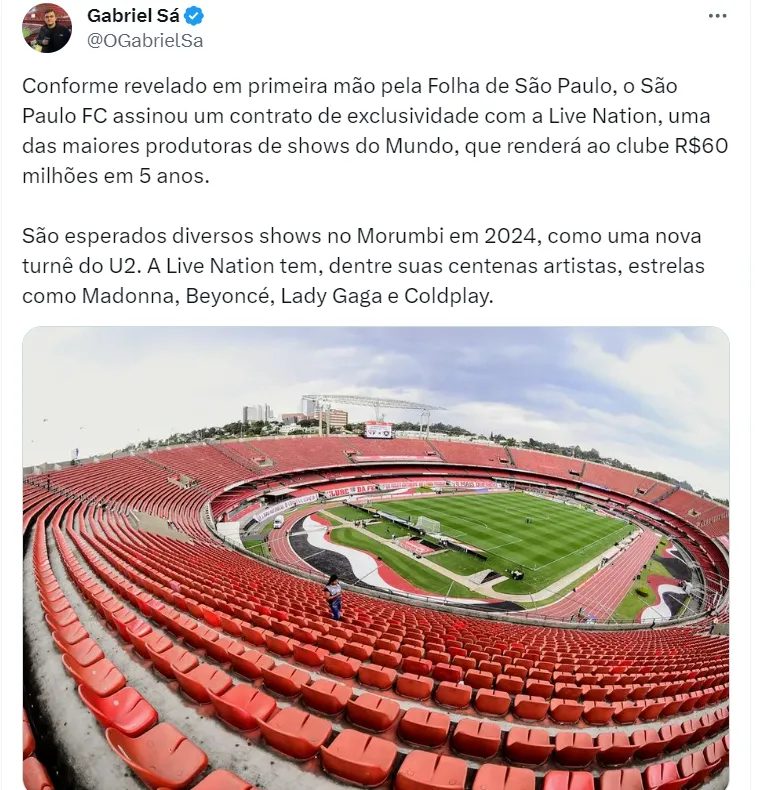 Segundo informações de Mônica Bergamo, o São Paulo acertou um contrato exclusivo com a Live Nation, grande produtora de eventos e show no mundo todo. A ideia é que o estádio do Morumbi seja um dos palcos da empresa durante os próximos cinco anos.