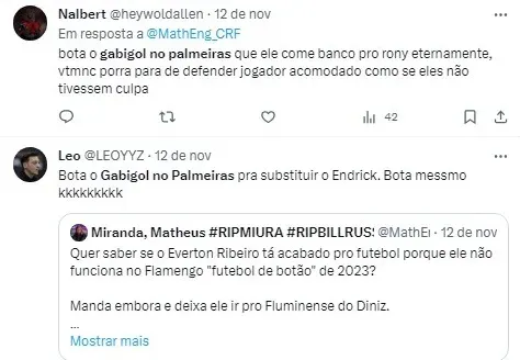 “O Palmeiras tem que ir as compras nesta janela, chacoalhar o mercado e contratar uns três bonecos. É muito complicado, a torcida do Palmeiras é muito exigente e com razão, não tem jeito. Subiu o sarrafo tem que subir a cobrança também. Tem um aspecto que eu considero importante e às vezes a galera pega no pé do Abel. Antes do cara ser uma estrela ele tem que ser subordinado ao Abel. Eu não sei se o Gabigol daria certo no Palmeiras. Não sei”, alertou Casimiro.