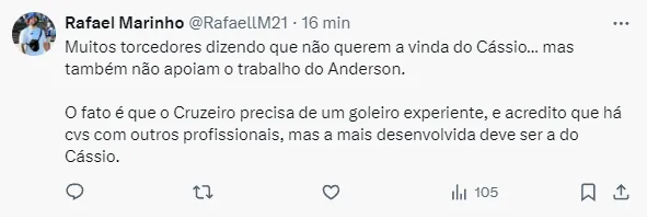 De acordo com o jornalista, Cássio chegou a um acordo verbal com o Cruzeiro. Agora, o time de Belo Horizonte precisará se acertar com o Corinthians para antecipar a liberação.