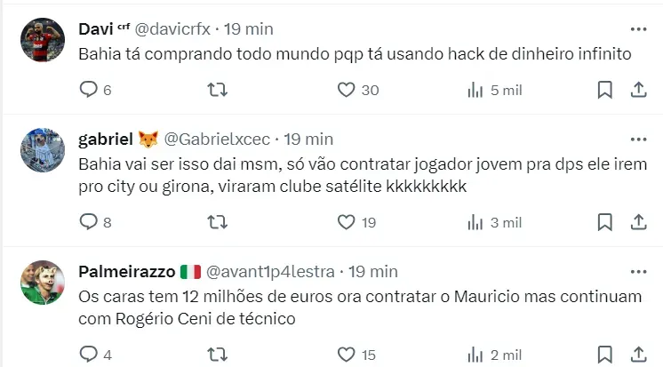 O Palmeiras ainda é um grande interessado no futebol do jogador, mas, hoje, o Bahia é o favorito para contar com o futebol de Maurício em 2024. O Grupo City entrou muito forte na disputa pelo atleta.