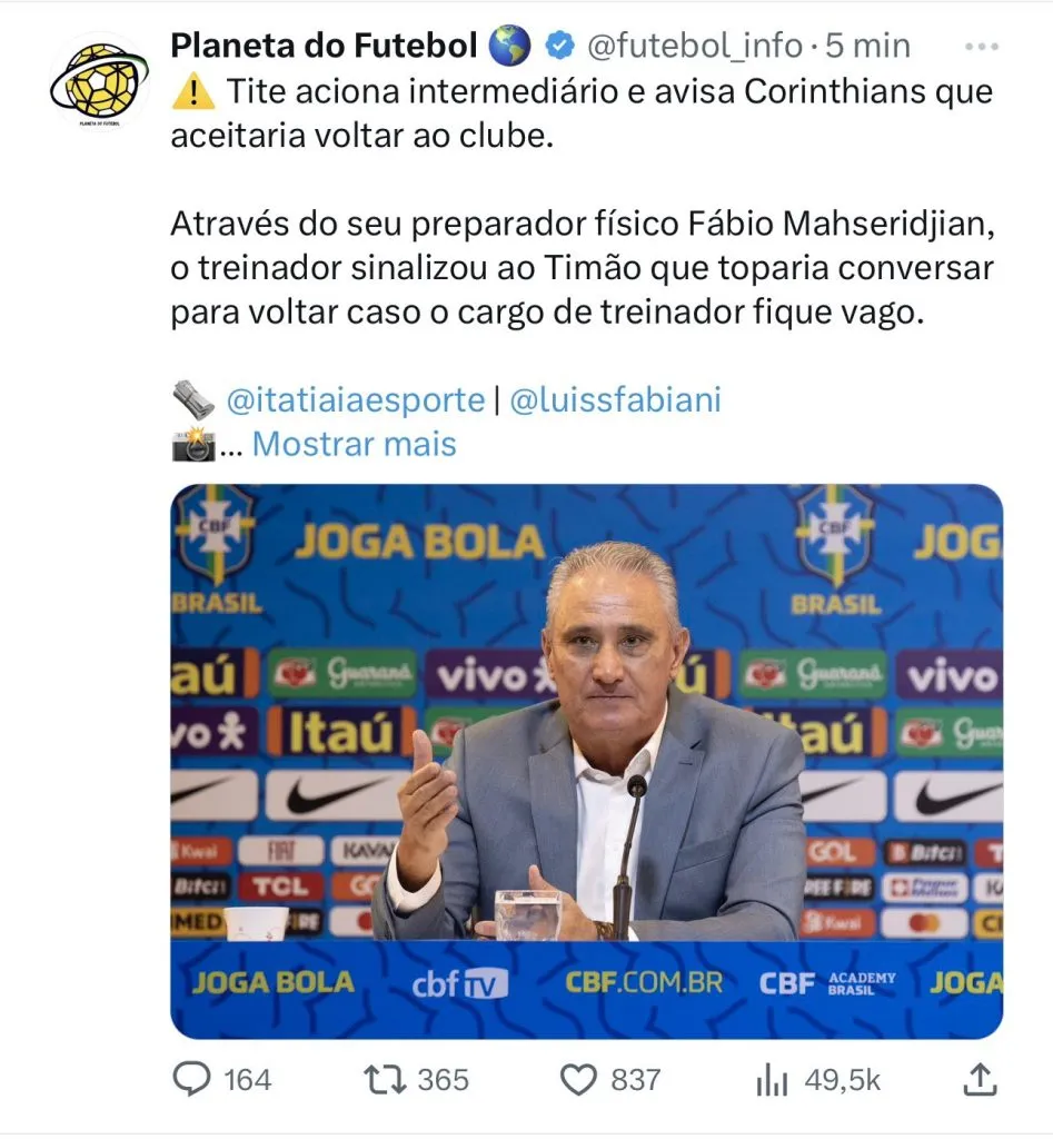 No entanto, o Flamengo corre o risco de perder a chance de ter Tite como treinador. Isso porque há informações de que o treinador teria aceitado assumir um novo projeto, e o Mengão pode acabar perdendo essa oportunidade histórica.