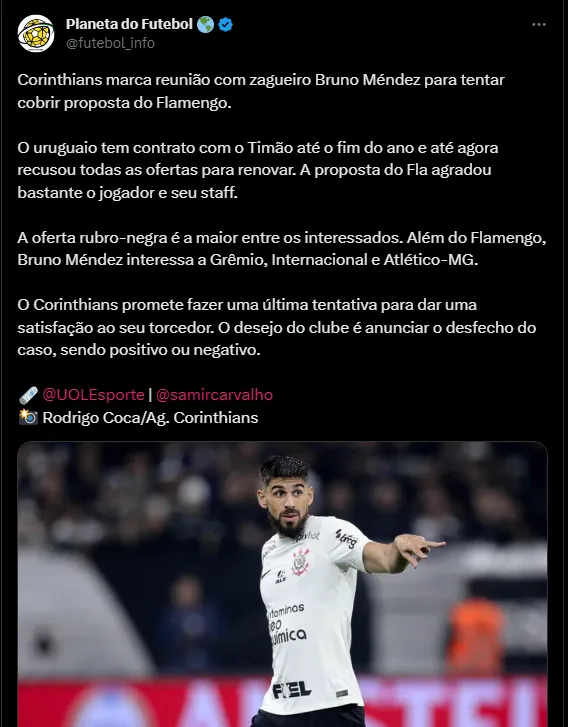 De acordo com as informações publicadas pelo jornalista Samir Carvalho, do UOL Esportes, o Corinthians marcou uma reunião com Bruno Méndez e seu staff para tentar cobrir a oferta do Flamengo e permanecer com o jogador.