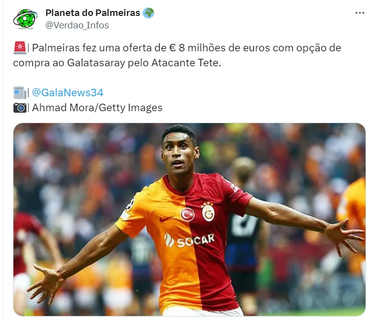 De acordo com informações do Gala News e também de Jorge Nicola, o Palmeiras teria feito uma oferta pasada de R$ 42 milhões ao Gatalasaray pelo atacante brasileiro Tetê, alvo de Bahia e Flamengo no mercado.